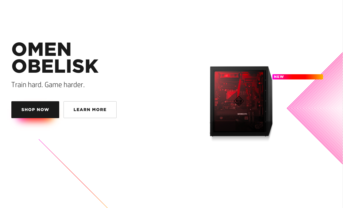 The sunburst color gradient is a great choice. It is vibrant and distinguishes OMEN from HP’s appropriately staid corporate profile. I also enjoy how refreshing it is compared to the faux-edgy red-on-black “hardcore gamer” aesthetic. The white vector graphics behind the laptop further contribute to the fun of the banner.